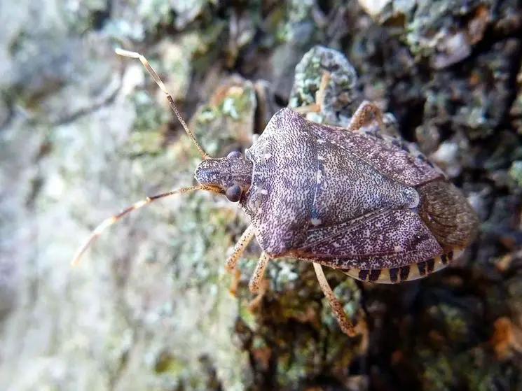 O inseto preto tem uma forma distinta de escudo e é marmorizado na cor marrom, com um típico triângulo mais escuro na extremidade do corpo. Na cabeça estão os aparelhos que chupa-ferrão e duas antenas com faixas de luz alternadas. Faixas alternadas também são visíveis no abdômen, de cor escura. Ele tem pernas marrons manchadas de luz e um par de asas com as quais pode fazer voos barulhentos para se mover de planta em planta. Uma característica desses insetos é o mau cheiro que exalam na fase defensiva e quando são esmagados, produzido por glândulas odoríferas localizadas na parte inferior do tórax e abdômen superior. É maior que o inseto verde e pode medir até 1,7 cm.